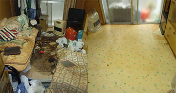 その居室(現場)は、ご遺族はもちろんハウスクリーニング業者の通常の清掃での原状回復は非常に困難です。 専門業者だからこそ、どんな現場でも躊躇せず、仕事をこなす迅速な対応力と独自の清掃(消臭・消毒・原状回復)のノウハウがありますので、お困りの際はぜひともお任せください。