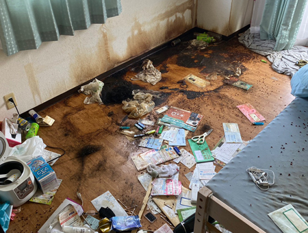 部屋の隅で亡くなっており、床はもちろん、壁も体液で汚れておりました。