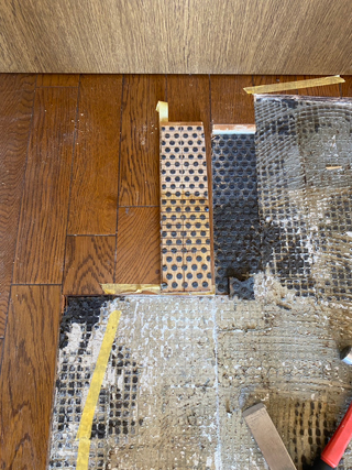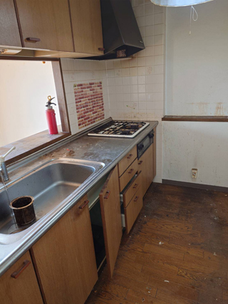 壁とその下の木材を撤去すると、壁の向こうのキッチン入り口前の廊下の下まで汚染が広がっていることが分かり、急遽キッチン廊下前のフローリングを撤去し、削り取り後に防臭塗料を塗布いたしました。