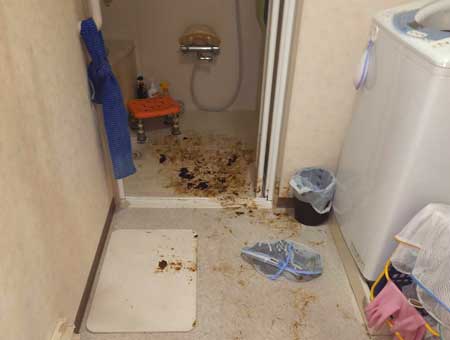 今回の特殊清掃(孤独死、浴室)は、この部屋にお独り暮らしだったお母さまが、入浴中にお風呂で倒れられ、そのまま這うように洗面を通ってから、トイレの前でお亡くなりになったという案件でした。