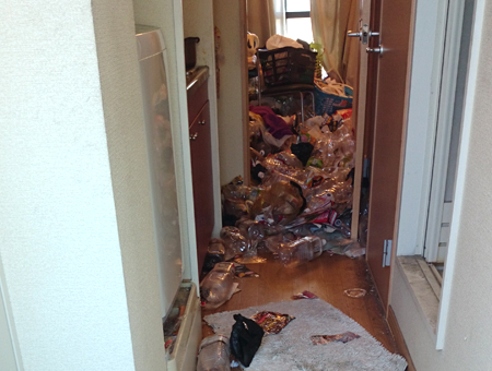 玄関から続く廊下には、広告や紙パックなどのゴミが散乱し、部屋の中からも物があふれ出していました。