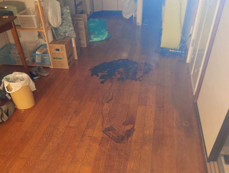 家財を撤去した後に、亡くなった場所の清掃と消毒をいたしましたが、フローリングの床には体液の染みが残っておりました。