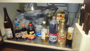 下棚の中には、袋や調味料などが置かれ、長年の汚れが蓄積していました。